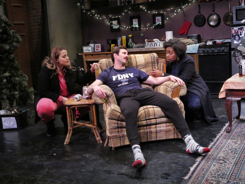 The play is set on the first New Years Eve after 9/11, when Generation X had their whole lives ahead of them but every moment was colored by the shock of the attacks. At this unique time, Katy and Jennifer are savoring their breakthrough into young adulthood and independence. They had both intended to ring in the new year with their boyfriends, celebrating with erotic raptures. But earlier in the evening, Jennifer’s boyfriend had turned her off by immature and inappropriate behavior. So as the ball was dropping, he’d gotten the boot. Katy’s casual partner, Bobby, has accidentally anesthetized himself with a generous helping of the meds he takes to stave off his PTSD from the attacks. He is zonked out in her bedroom. Slamming the front door to shut out the flasher, Katy and Jennifer look to this now-somnolent example of manliness for protection, with hilarious consequences.