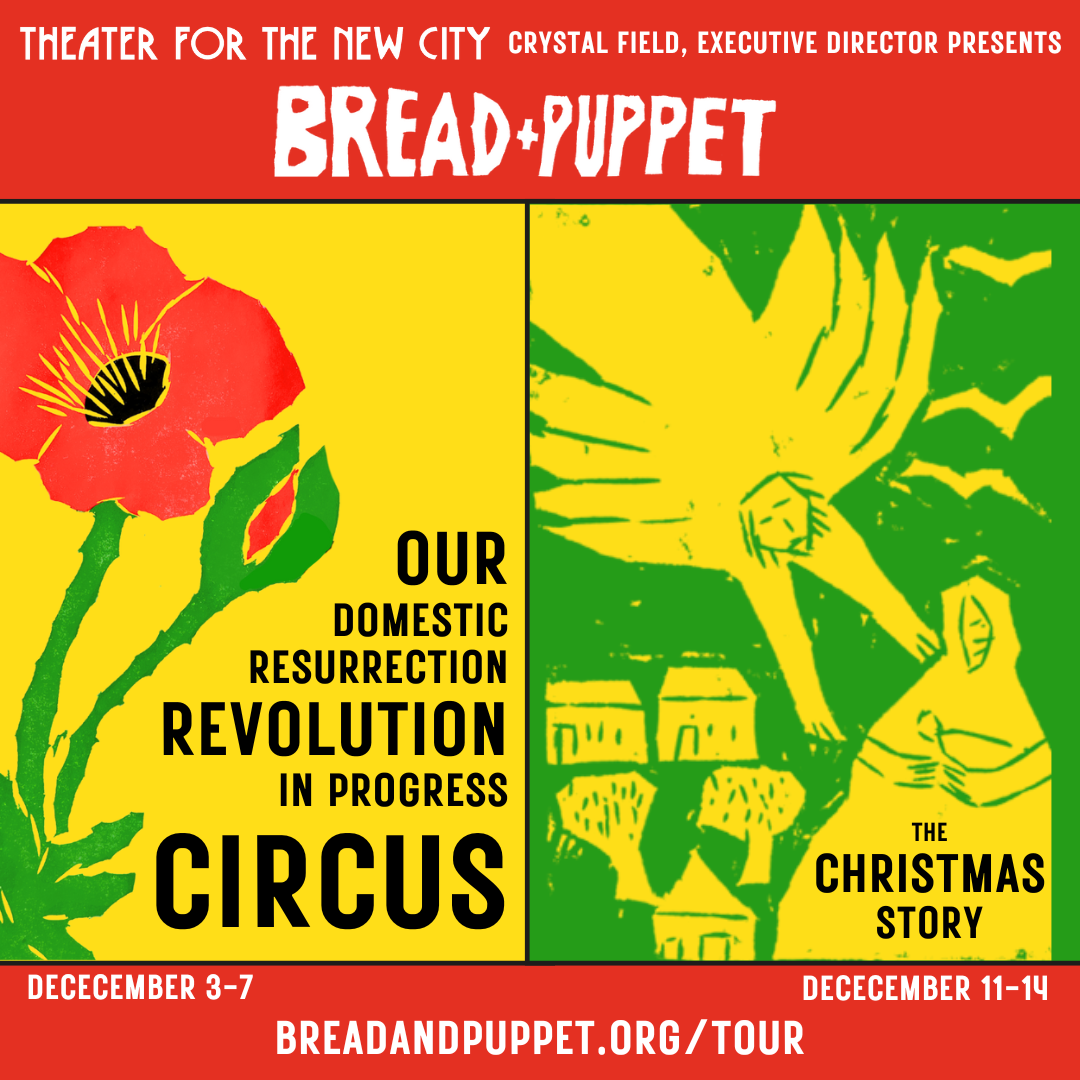 Join Bread & Puppet for an urgently-needed retelling of the first Christmas. In the tradition of the medieval mystery plays, this show combines reverence and impudence to speak to this exact moment. Mary and Joseph sleep with the cows because they don’t have $26.50 for a room at the Sandy Arms motel. King Herod laments the balance-of-payment deficit. The bubble-headed bourgeoisie of Jerusalem dismiss the star in the east as a publicity stunt. See this ancient story remade for today’s horrors and today’s badly needed cry for an end to war.