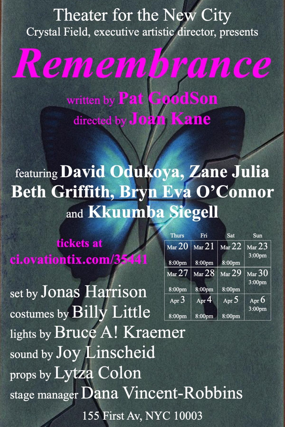 Ms. Goodson made her living for the past 25 years as a retail manager at Macy’s, JFK Airport and The Smithsonian. She has been a writer and story teller since grade school and has always been an avid theatergoer, which nurtured her desire to work behind-the-scenes. For the past four years, she has volunteered at Theater for the New City, assisting Executive Artistic Director Crystal Field. Her experiences there led to her participation in TNC’s Emerging Playwrights Program, fusing her passion for writing with her love for the theater. This program is integral to the theater’s mission, which includes being a center for new and innovative theater arts, discovering relevant new writing and nurturing new playwrights. Ms. Goodson writes, “Theater for the New City is an extremely important vehicle for keeping real theater alive. It is about theater as an art form. Crystal Field enables artists, be they scenic or costume designers or budding playwrights like myself, to collaborate and create theatrical magic. Her support, with her vast experience, gives a newbie a strong foundation upon which to build their art.”