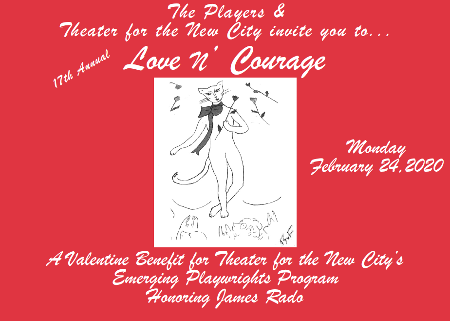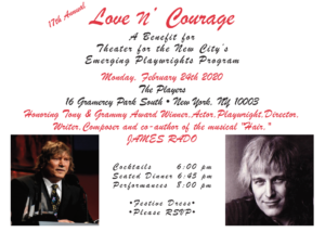 NEW YORK, January 20 — Theater for the New City’s Emerging Playwrights Program will be beneficiary of the theater’s 17th Annual Love ‘n Courage benefit Monday, February 24, 2020 at The Players, 16 Gramercy Park South. The evening honors James Rado, the Tony and Grammy Award winning, actor, playwright, composer and co-author of the musical “Hair.”