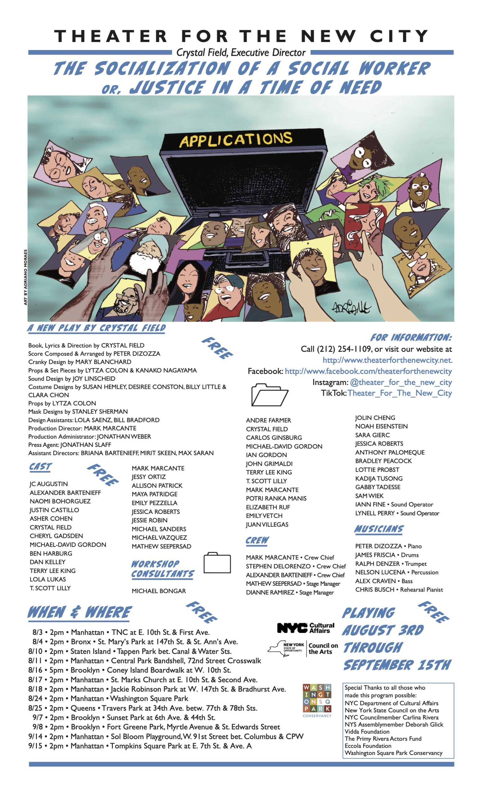 NEW YORK, July 2 – Theater for the New City’s award-winning Street Theater Company will open its 2024 annual tour Saturday, August 3 with “The Socialization of a Social Worker or The Fight for Social Justice,” a rip-roaring original musical which tells a story of a humanitarian case worker learning to overcome despair and find strength for today’s challenges through people power. Book, lyrics and direction are by Crystal Field, Artistic Director of Theater for the New City (TNC). The musical score is composed and arranged by Peter Dizzoza. Free performances will tour parks, playgrounds and closed-off streets throughout the five boroughs through September 15.