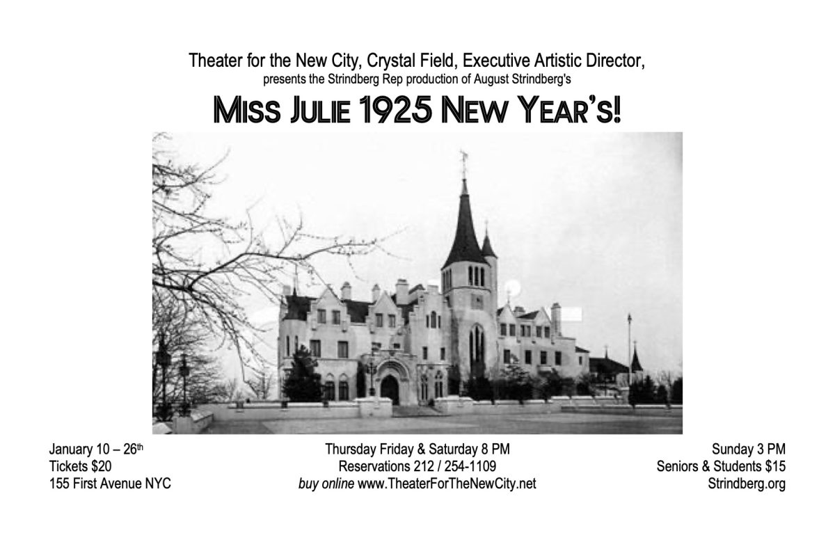 “Miss Julie” by August Strindberg centers on a proud, neurotic daughter of the degenerate aristocracy who is willing to sink her pride in a frenzied attempt to satisfy her love of sensation. Strindberg originally set the play in a Swedish manor house in 1888. From January 9 to 26, Theater for the New City will present Strindberg Rep in a production, translated from the Swedish, adapted and directed by Robert Greer, that transplants Strindberg’s story to a Long Island country estate in 1925.