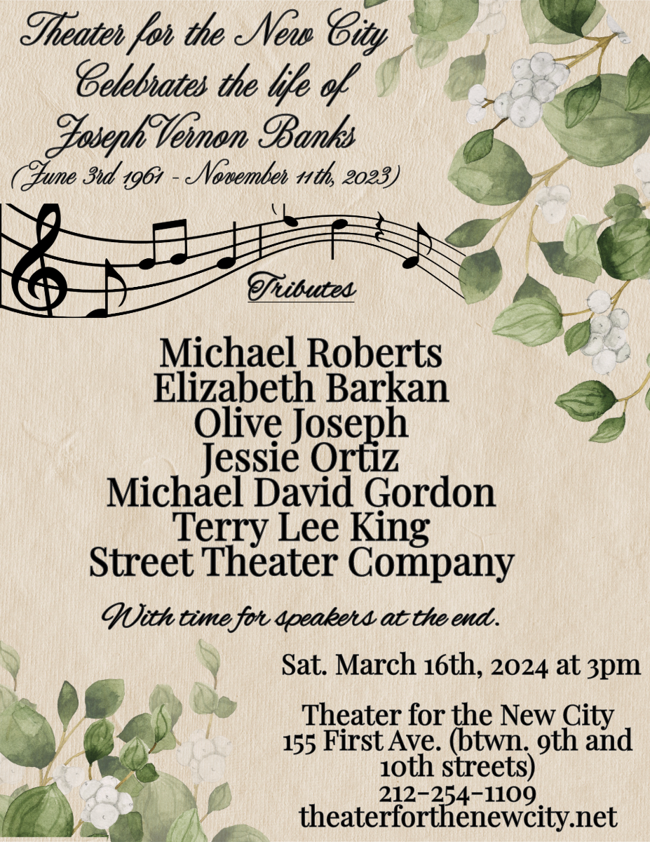 NEW YORK — On March 16 at 3:00 PM, Theater for the New City (TNC), 155 First Avenue (at East Tenth Street), will celebrate the life of Joseph Vernon Banks, the long-time composer of its Street Theater productions, who died at age 62 on November 11, 2023.