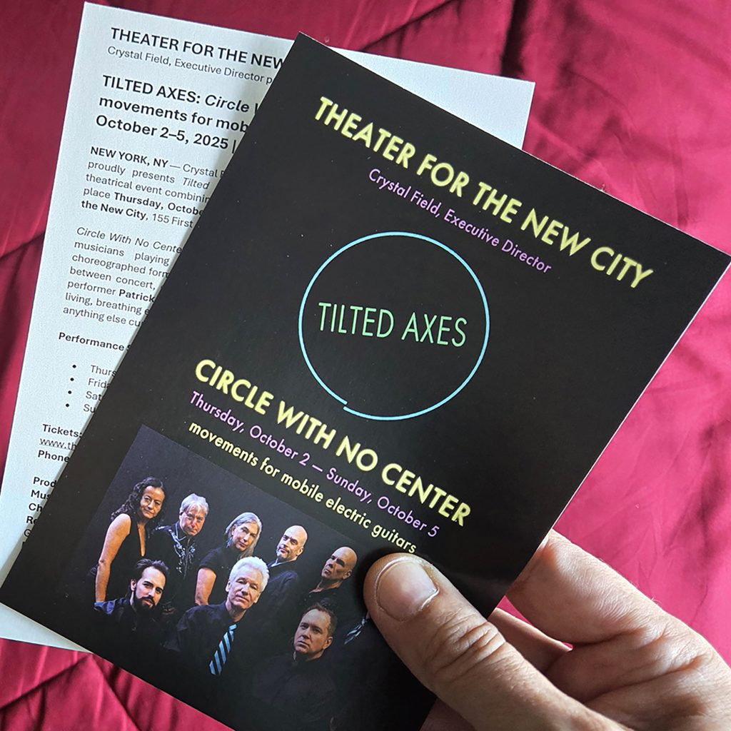 Circle With No Center transforms the stage into a dynamic landscape where musicians playing mobile electric guitars and percussion move in choreographed formations, weaving intricate sonic textures that blur the lines between concert, dance, and immersive theater. Created by composer and performer Patrick Grant, the work invites audiences to experience music as a living, breathing environment — part ritual, part procession, and entirely unlike anything else currently on the New York stage.