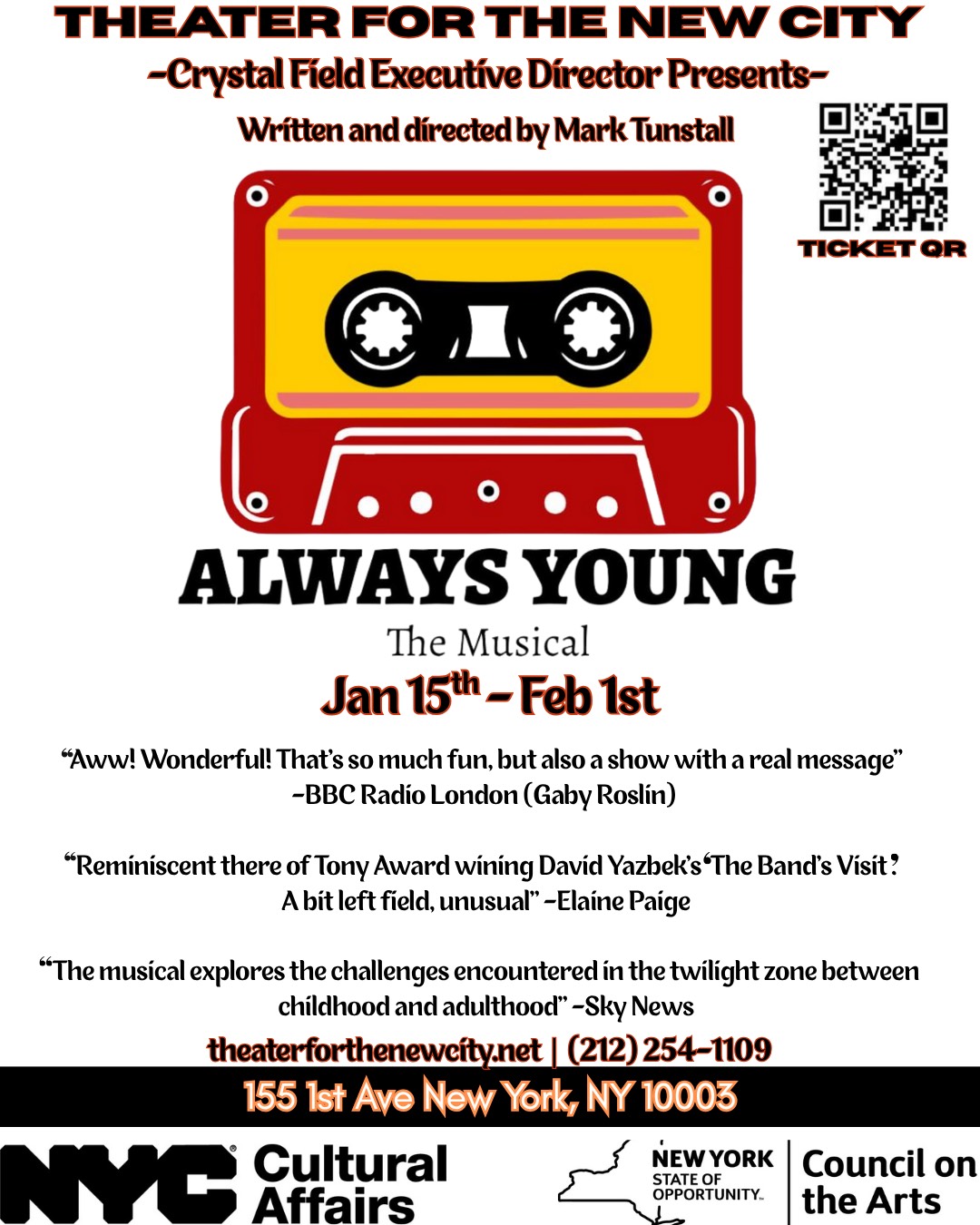 THEATER FOR THE NEW CITY is a unique Cultural Institution that has earned a nationwide reputation for its dedication to nurturing established and emerging playwrights who experiment with new forms and to presenting other experimental and developmental theaters with a very active program of Community Art Services and Festivals which continue to expand theater accessibility.